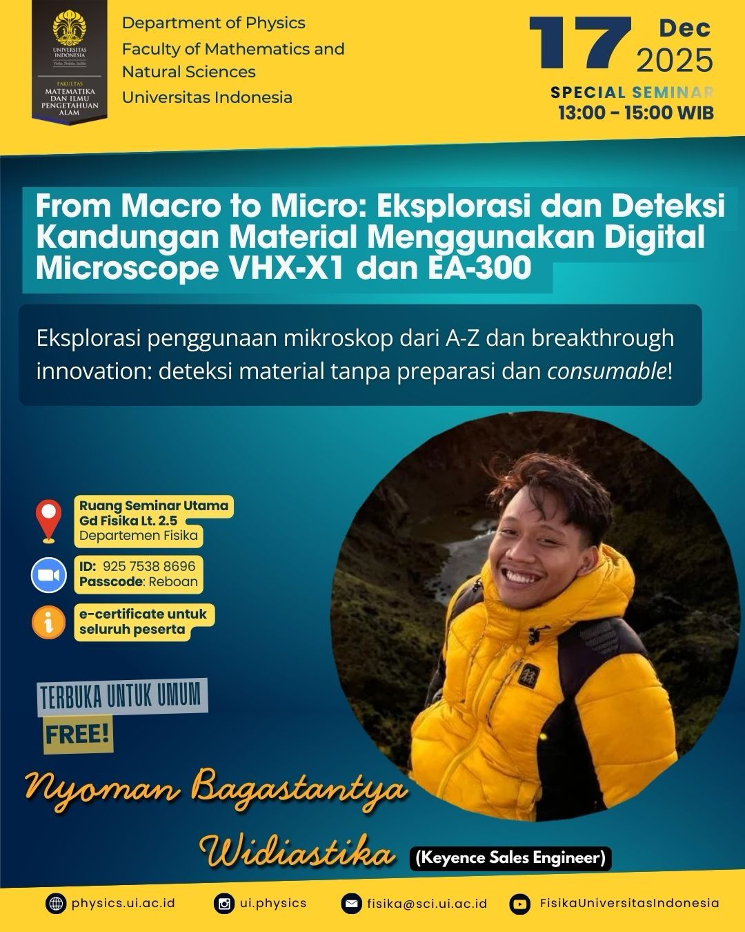 π’ Weekly Seminar Departemen Fisika UI π¬ From Macro to Micro: Eksplorasi dan Deteksi Kandungan Material Menggunakan Digital Microscope VHX-X1 dan EA-300 π€ Pembicara: Nyoman Bagastantya Widiastika (Keyence Sales Engineer) π¬ Pada seminar kali ini,